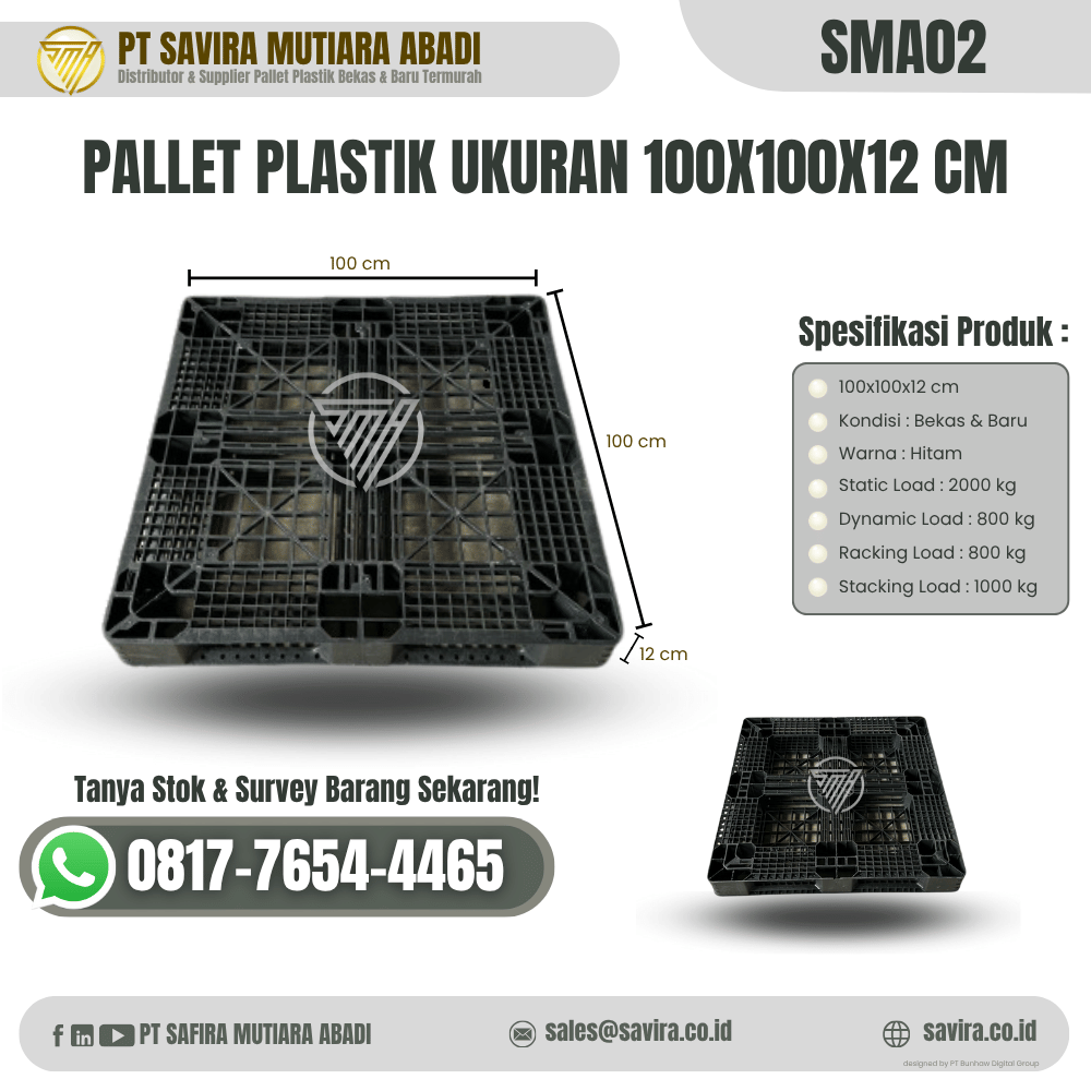 Salah satu produk unggulan kami adalah Pallet Plastik SMA02, berukuran 100x100x12 cm dengan warna hitam. Terbuat dari HDPE/PP (High Density Polyethylene/Polypropylene), pallet ini kuat, tahan benturan, dan mampu menahan beban berat sekaligus kondisi lingkungan ekstrem. Dengan berat 6 kg, pallet ini efisien untuk penyimpanan, pengangkutan, dan distribusi barang di berbagai skala usaha.