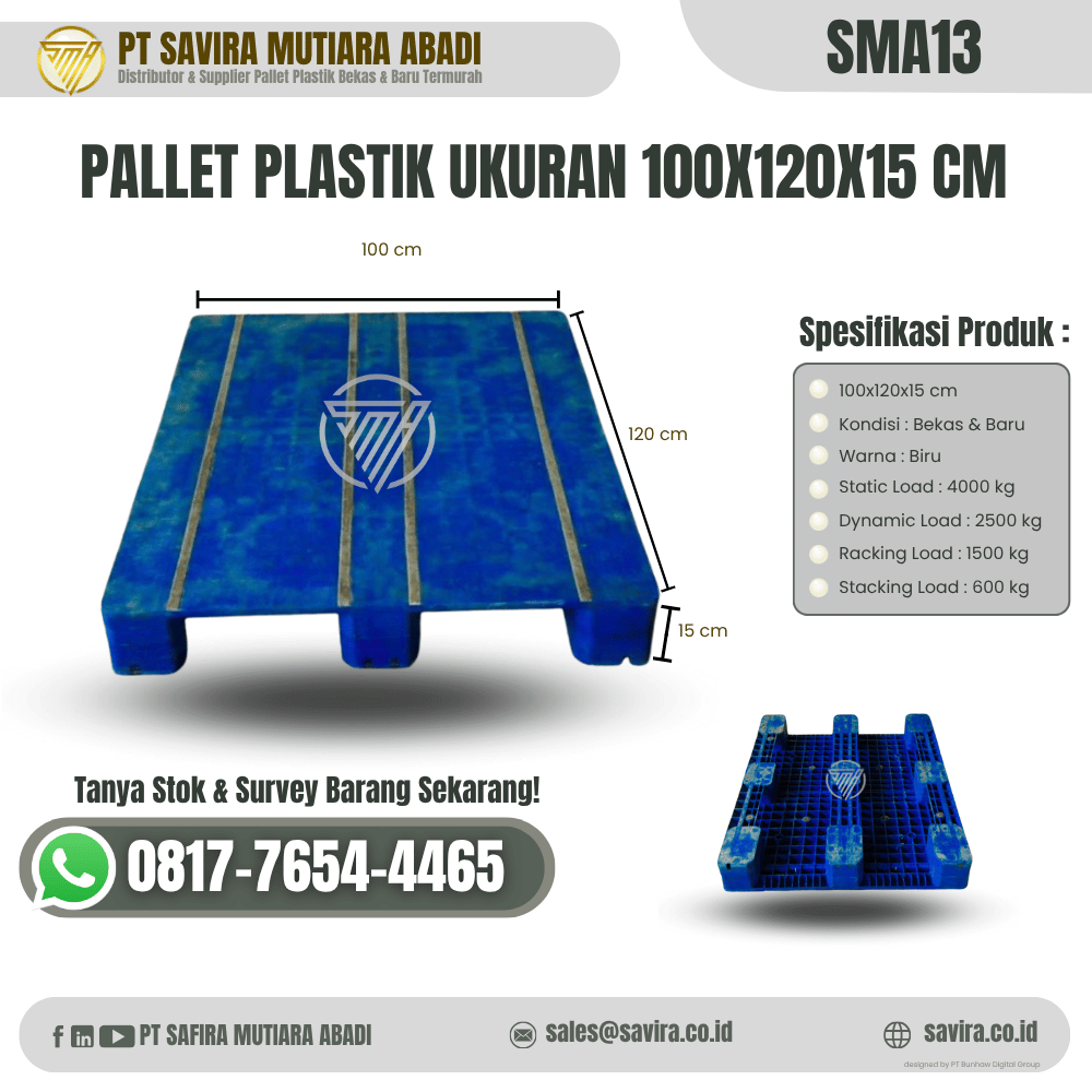PT SAVIRA MUTIARA ABADI mempersembahkan Pallet Plastik SMA13 ukuran 100x120x15 cm, tersedia dalam kondisi baru dan bekas, sebagai pilihan ideal untuk kebutuhan pergudangan, distribusi, maupun ekspor. Terbuat dari bahan HDPE/PP berkualitas tinggi, pallet ini dirancang kuat, tahan banting, dan awet, siap mendukung operasional logistik Anda secara optimal.