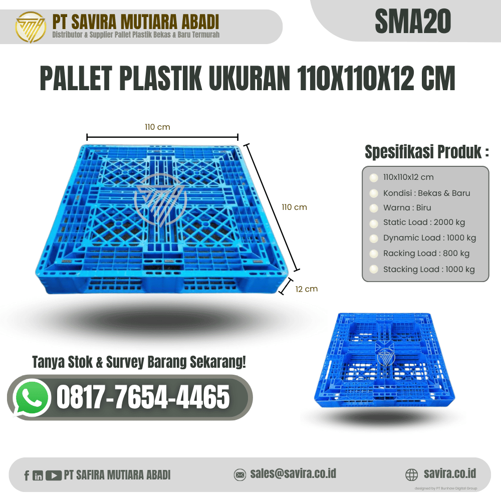 PT SAVIRA MUTIARA ABADI menghadirkan Pallet Plastik SMA20 ukuran 110x110x12 cm, tersedia dalam kondisi baru dan bekas, sebagai pilihan ideal untuk kebutuhan pergudangan, distribusi, dan ekspor. Terbuat dari bahan HDPE/PP berkualitas tinggi, pallet ini dirancang kuat, tahan banting, dan awet, mendukung operasional logistik Anda dengan efisien dan aman.