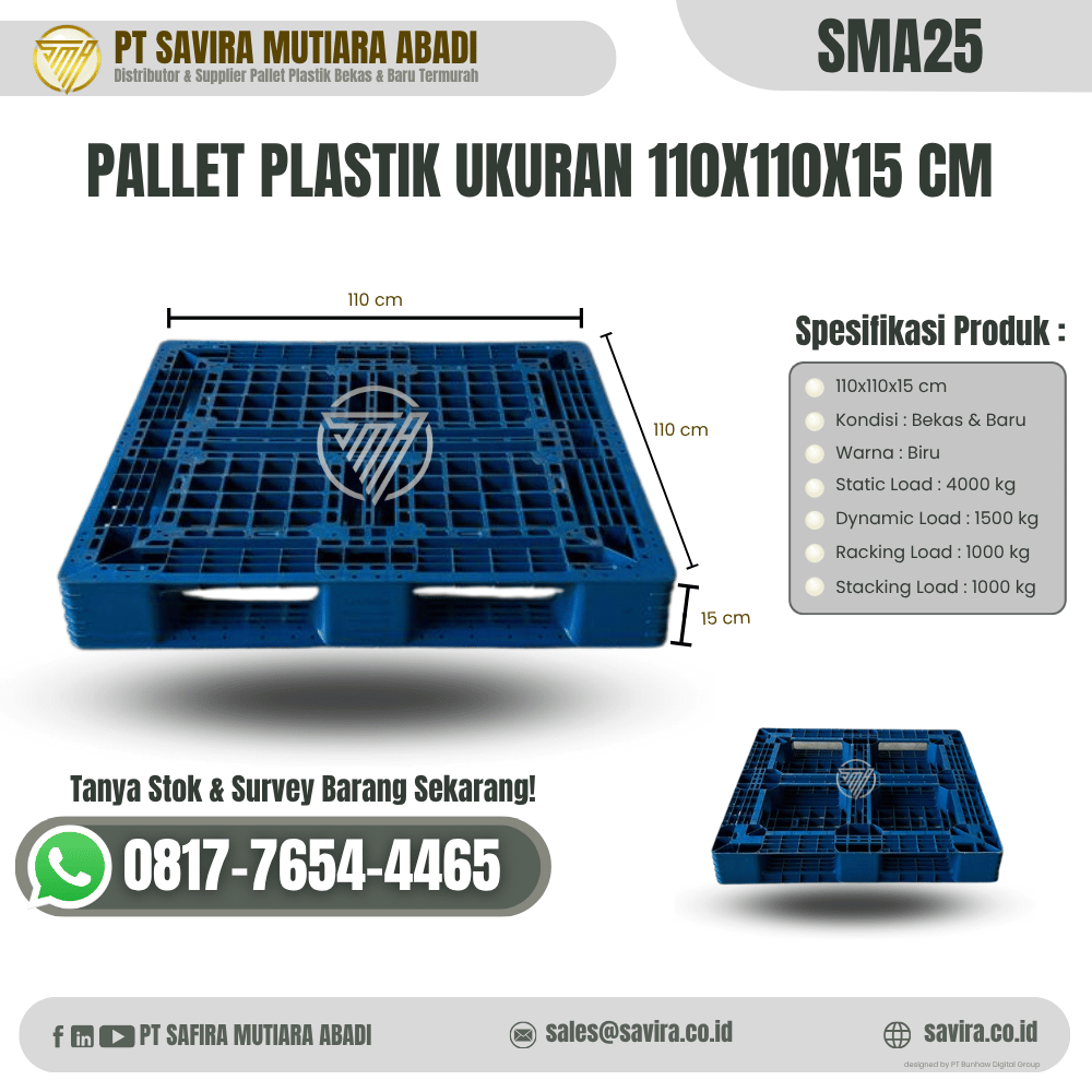 PT SAVIRA MUTIARA ABADI menghadirkan Pallet Plastik SMA25 ukuran 110x110x15 cm, tersedia dalam kondisi baru dan bekas, sebagai pilihan tepat untuk kebutuhan pergudangan, distribusi, dan ekspor. Terbuat dari bahan HDPE/PP berkualitas tinggi, pallet ini dirancang kuat, tahan banting, dan awet, mendukung operasional logistik Anda secara efisien dan aman.