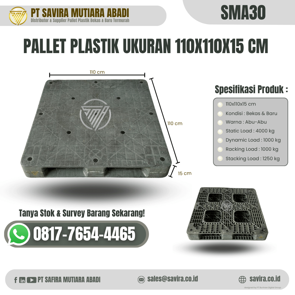 PT SAVIRA MUTIARA ABADI mempersembahkan Pallet Plastik SMA30 ukuran 110x110x15 cm, tersedia dalam kondisi baru dan bekas, sebagai solusi ideal untuk pergudangan, distribusi, dan ekspor. Dibuat dari bahan HDPE/PP berkualitas tinggi, pallet ini dirancang kuat, tahan banting, dan awet, memastikan operasional logistik Anda berjalan efisien dan aman.