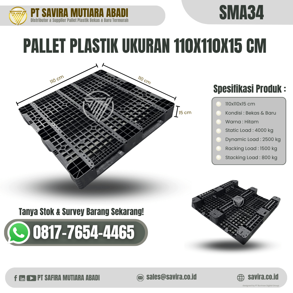 Salah satu produk unggulan adalah Pallet Plastik SMA34 berukuran 110x110x15 cm. Pallet ini terbuat dari bahan HDPE atau PP, material plastik yang terkenal kuat, tahan banting, dan awet digunakan dalam jangka panjang. Berkat kualitas bahan tersebut, pallet ini tidak mudah rusak dan tetap stabil meskipun digunakan berulang kali.